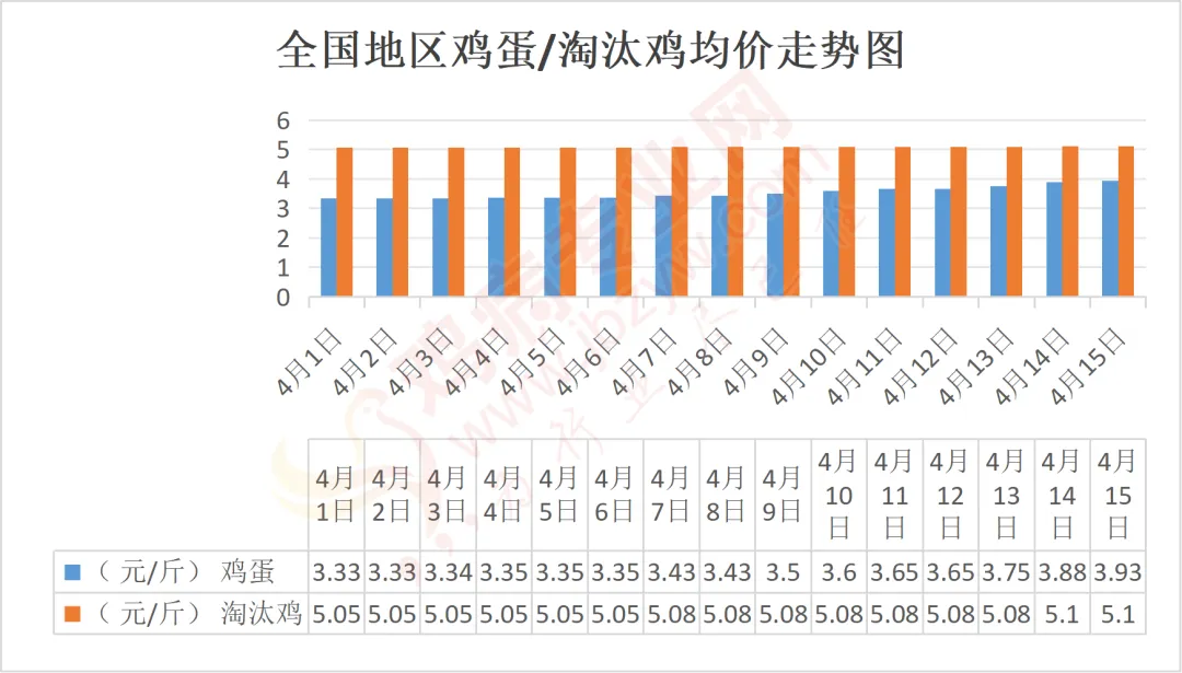 河南地区:南阳鸡蛋3.9-3.95元/斤,与昨日相比持平,淘汰鸡5.3元/斤;
