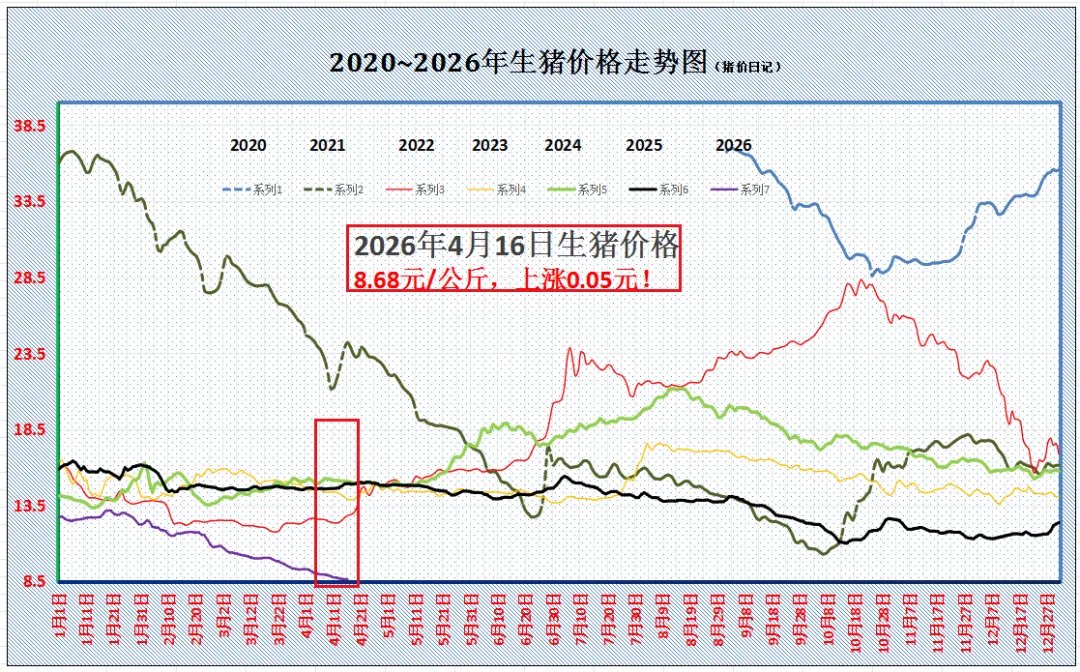 2026.4.17-明天猪价时光荏苒,4月过半,国内生猪市场,猪价止跌回暖,此前,外三元标猪报价触底8.63元/公斤,猪价刷新近10年新低,同比下降近41.5%,相比年初降幅也近34%,生猪市场超预期下降,主要受供需失衡影响! 一方面,消费市场处于周期性淡季,春节后,内销市场以及城市需求缺乏增量,居民饮食习惯变化,肉类需求减少,且,时令蔬菜供应增多,居民替代消费增加; 另一方面,由于前期母猪存栏去化停滞,能繁母猪存栏维持高位,且,产能效率大幅提升,单位母猪存栏提供仔猪水平大幅增加,进一步加剧了春节后适重标猪供应的能力!而随着气温回升,标猪上肉加快,但是,标肥价差收窄,且,春节后饲料成本大幅提升,养殖端压栏缺乏性价比,加剧了生猪认卖的意愿! 目前,猪价呈现底部震荡的走势,短暂猪价触底阶段性新低后,市场底部支撑略有转强! 在供应端,区域生猪出栏节奏分歧,北方地区,此前集团猪企持续增量减重出栏,规模猪企出栏压力减轻,且,部分头部猪企出栏体重下降,当前,供应压力有所减轻!但是,南方地区,养殖端出栏完成计划一般,生猪供应压力依然较大,猪价仍面临一定压力! 在需求端,目前,消费需求缓慢回升!一方面,猪肉价格大幅下降,低价猪肉刺激下,内销市场农村集市猪肉购销增加,另一方面,距离五一小长假还剩2周时间,节日前下游市场存在集中备货需求,这刺激了市场看涨的信心! 叠加,在游资抄底方面,近期,二育滚动入场,部分地区,二育积极性有所增加,且,屠宰场看涨三季度猪价前景,当前逢低采购标猪分割入库的积极性较高! 由此分析,在供需博弈下,受屠宰场调价,预计,4月17日,外三元标猪报价在8.75元/公斤,后市关注集团猪企出栏节奏的变化!