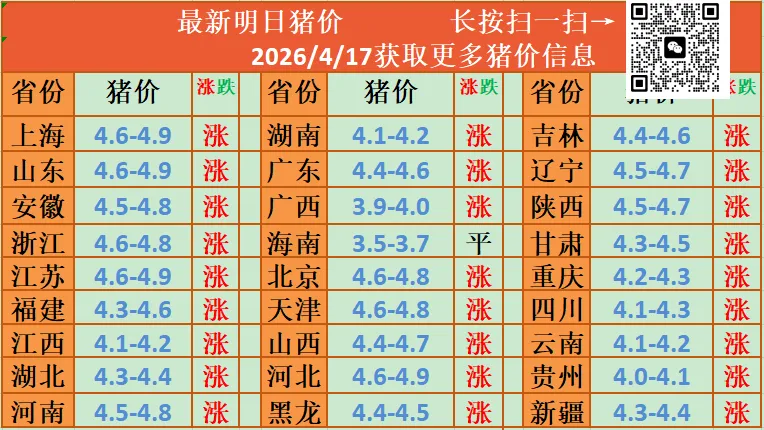 2026.4月17号-最新明日猪价( 全国猪价!) 养羊网 2026-04-16 2026.4月17号-最新明日猪价( 全国猪价!) 养羊网 2026-04-16 上一篇:2026年4月17日全国猪价信息/供大家参考 下一篇:26.4.16 明日猪价 全面上涨!北方强势拉升 您可能还会对下面的文章感兴趣111: 相关文章 2026.1.29猪价快讯--福州穗丰动保 乌兰哈达火山的治愈时光 2025年4月13日全国各地生猪价格信息 【生猪周度策略观察】年后猪价持续下跌何时筑底?————3.2