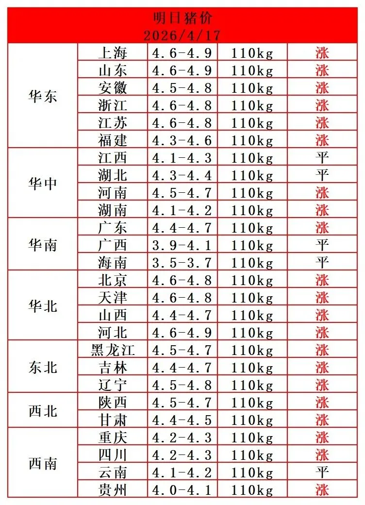 2026.4.17-明日猪价天天报(牛气冲天,猪价又是满堂红!) 养羊网 2026-04-16 2026.4.17-明日猪价天天报(牛气冲天,猪价又是满堂红!) 养羊网 2026-04-16 上一篇:2026-04-17明日猪价 下一篇:2026年04月16日全国猪价概览 您可能还会对下面的文章感兴趣111: 相关文章 4月10日鸡蛋价格 1月19日猪价速递 【猪价大预测】1月11日~1月14日全国猪价 近期价格更新!!!