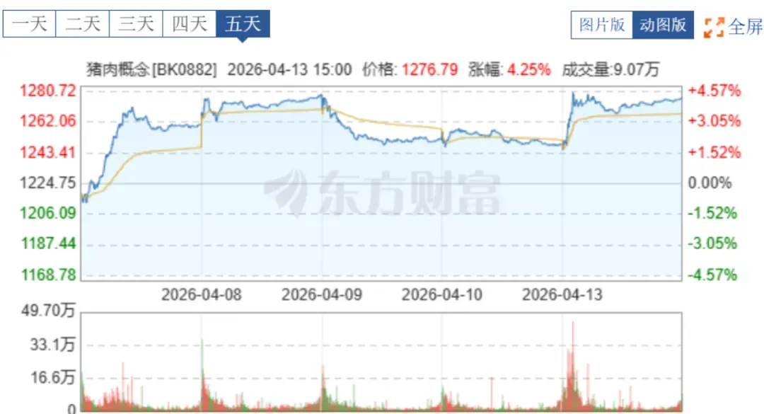 资本市场层面,4月13日猪肉概念板块盘中震荡反弹,个股呈现普涨行情:截至收盘,天邦食品、金字火腿涨停,巨星农牧、大禹生物涨超5%,立华股份、牧原股份、龙大美食、新五丰、正邦科技等多股纷纷跟涨,板块整体表现活跃。