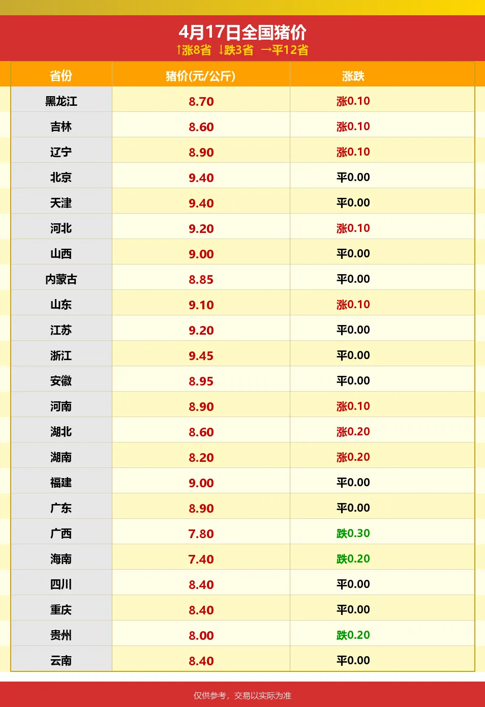 4月17日明天猪价!6省涨3省跌,稳中上涨! 养羊网 2026-04-16 4月17日明天猪价!6省涨3省跌,稳中上涨! 养羊网 2026-04-16 上一篇:一夜升温,14省上涨,猪价终于反弹!行情要变天了? 下一篇:2026.4.17最新猪价 您可能还会对下面的文章感兴趣111: 相关文章 笨鸡蛋?,笨鸡蛋?105元一个,快递发货 分别在京d和盒m买了2个品牌的羊排 近期价格更新!!! 猪肉价格暴跌,市场供需现新格局