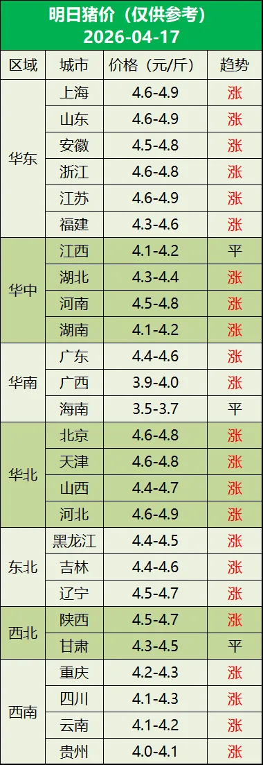 明日猪价(2026年04月17日,猪价上涨!!!) 养羊网 2026-04-16 明日猪价(2026年04月17日,猪价上涨!!!) 养羊网 2026-04-16 上一篇:4月17日-明天猪价参考!(安徽4.6-5.0元/斤! 大部上涨!全线飘红!) 下一篇:【超前猪价大预测】4月18日~4月20日!五一前猪价能上涨吗?9月后有望迎来回暖! 您可能还会对下面的文章感兴趣111: 相关文章 100W能做什么生意 2025年4月13日全国各地生猪价格信息 2025年4月13日全国各地生猪价格信息 震惊!今年羊绒衫都离谱到这种价格了吗??