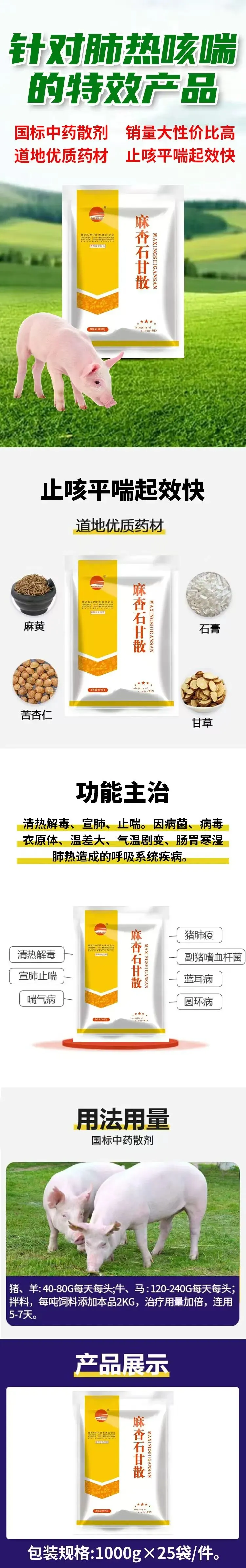 4、家畜病毒性、细菌性感染导致的发热、咳喘、张口呼吸的配合治疗。