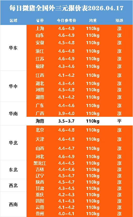 明日最新猪价2026.04.17——久违的全面飘红!点击蓝字关注 猪价不错过