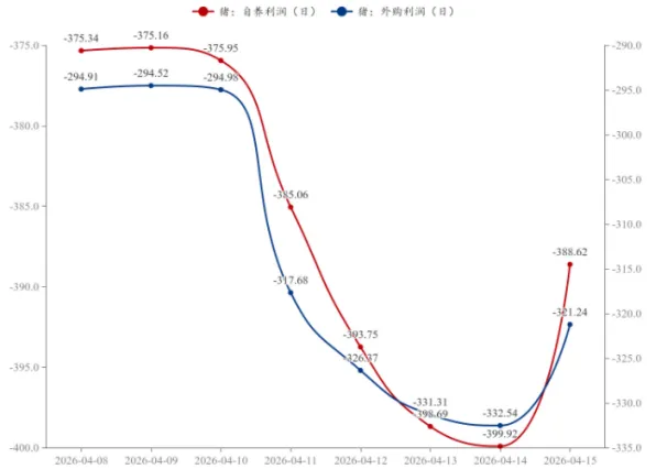 养殖户挺价和放缓出栏,原因非常直观,亏损实在太严重,虽然周三开始有大反弹,但依旧还是深度亏损中,其中,自养仔猪亏损还在388元/头,外购仔猪亏损还在320元/头左右。