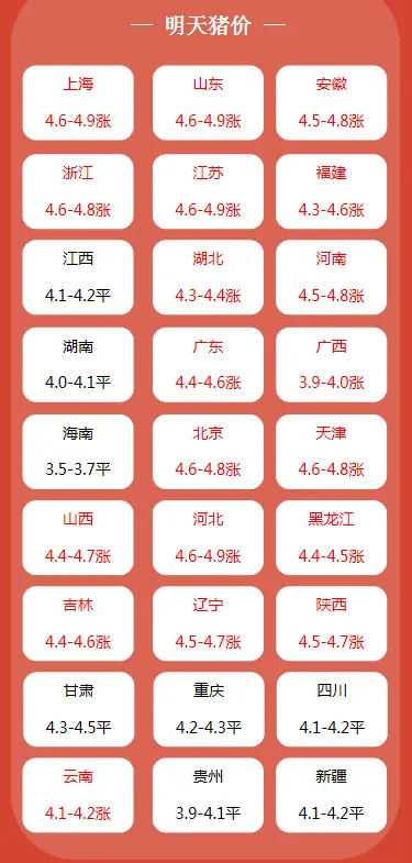 2026.04.17-明天猪价(多地上涨,势头大好!) 养羊网 2026-04-16 2026.04.17-明天猪价(多地上涨,势头大好!) 养羊网 2026-04-16 上一篇:猪价“跌跌不休”,股市却逆势上扬,背后究竟藏着什么密码? 下一篇:明日2026年4月17日全国猪价行情预测 您可能还会对下面的文章感兴趣111: 相关文章 2025年4月13日全国各地生猪价格信息 2025年4月13日全国各地生猪价格信息 3月25日领航农牧猪价汇总 这些你都知道吗