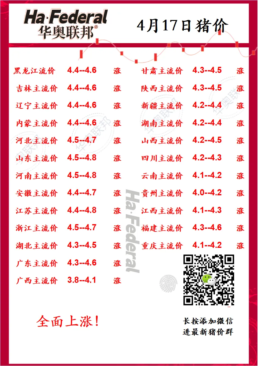 4月17最新猪价 全面上涨! 养羊网 2026-04-16 4月17最新猪价 全面上涨!进最新报价群 加微信 v联系电话:137 ?0084 ?5054 养羊网 2026-04-16 上一篇:4月16日鸡蛋价格更新 下一篇:2026 . 04.17 猪价 您可能还会对下面的文章感兴趣111: 相关文章 11.20今天4??只?到手? 猪价跌入“6元时代”,赶紧买肉! 近期价格更新!!! 猪价丨1月8日 明日猪价早知道