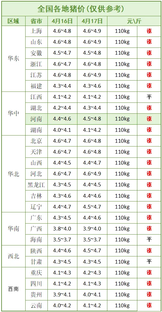 | ? ? ? 4 月 17 日猪价全线飘红,全国迎来回暖!北方缩量挺价效应显现,华东、华北领涨。全国均价小幅上行,市场情绪稳步修复,五一节前备货预期持续发酵。 |