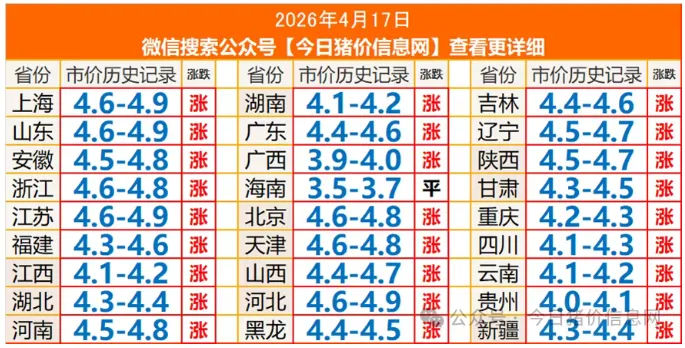 2026年04月17日全国猪价行情表 养羊网 2026-04-16 2026年04月17日全国猪价行情表以上内容源于网络,如有侵权请与我们联系,将及时删除。来源丨今日猪价信息网 养羊网 2026-04-16 上一篇:假若9元/公斤猪价横跨二季度,主要上市猪企的“压力”预判 下一篇:2026年04月17日猪价播报 您可能还会对下面的文章感兴趣111: 相关文章 3月19日广西鸡蛋价格参考 【报明天猪价】2026.4.17 全国猪价! 2025年4月13日全国各地生猪价格信息 猪价突变!2026.1.3各地生猪价格信息!