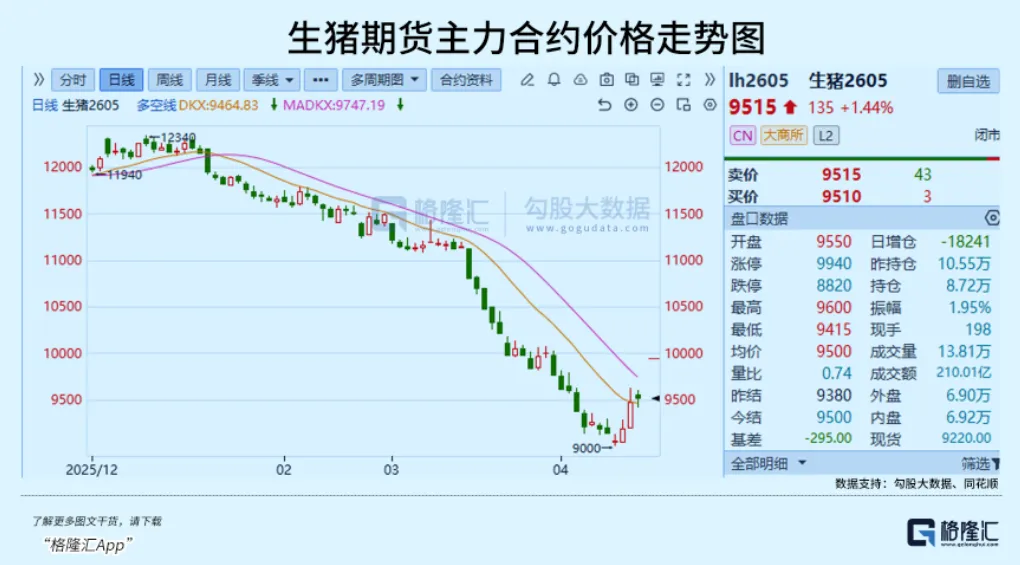 然而,生猪连续主力合约已经开始拉升,近3个交易日持续上涨,自低点至今反弹超5%,现报9515元。