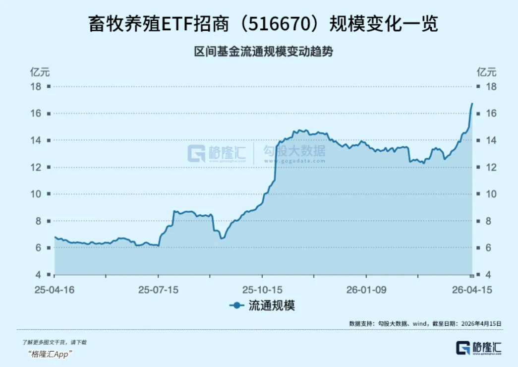 与此同时,截至4月15日,畜牧养殖ETF招商(516670)连续5个交易日内获资金连续净流入合计1.8亿元,年初至今份额增长4.38亿份,位居养殖类ETF第一。