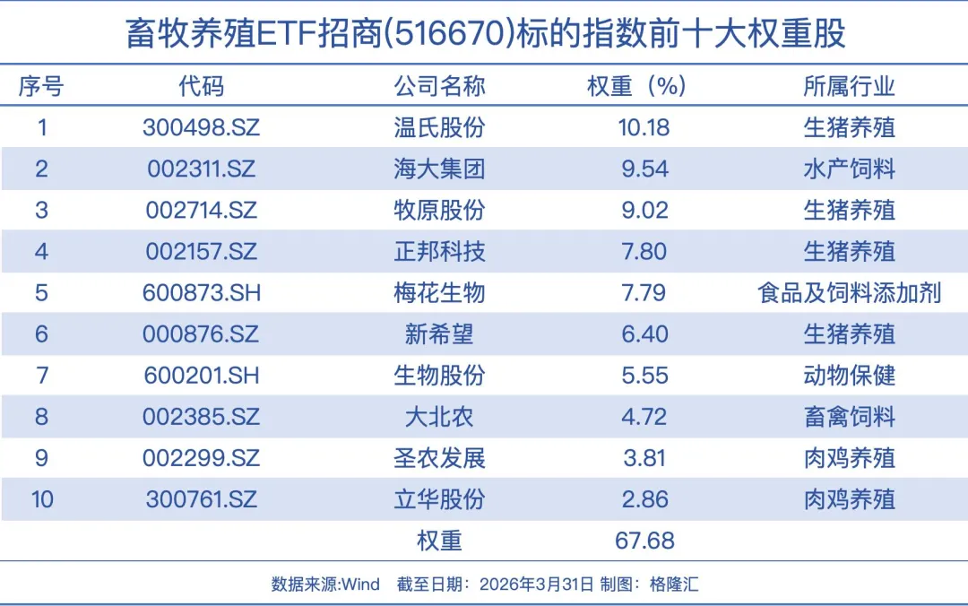 畜牧养殖ETF招商(516670)跟踪中证畜牧养殖指数,聚焦A股上市的头部养殖企业,“含猪率”超过六成,疫苗,饲料等养猪上下游+禽类、水产等养殖概念占比约40%,前十大成份股覆盖温氏股份、海大集团、牧原股份、正邦科技、梅花生物、新希望等养殖行业龙头。