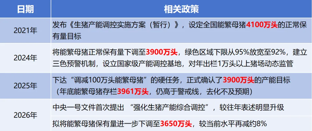 近两年,政策端对产能的调控力度明显加强(见下图)。从2024年开始,能繁母猪保有量持续下调,今年3月,监管部门将这个目标进一步收缩至3650万头左右,消息公布后猪肉概念股曾一度迎来集体上涨,但不久后又跌了回去。