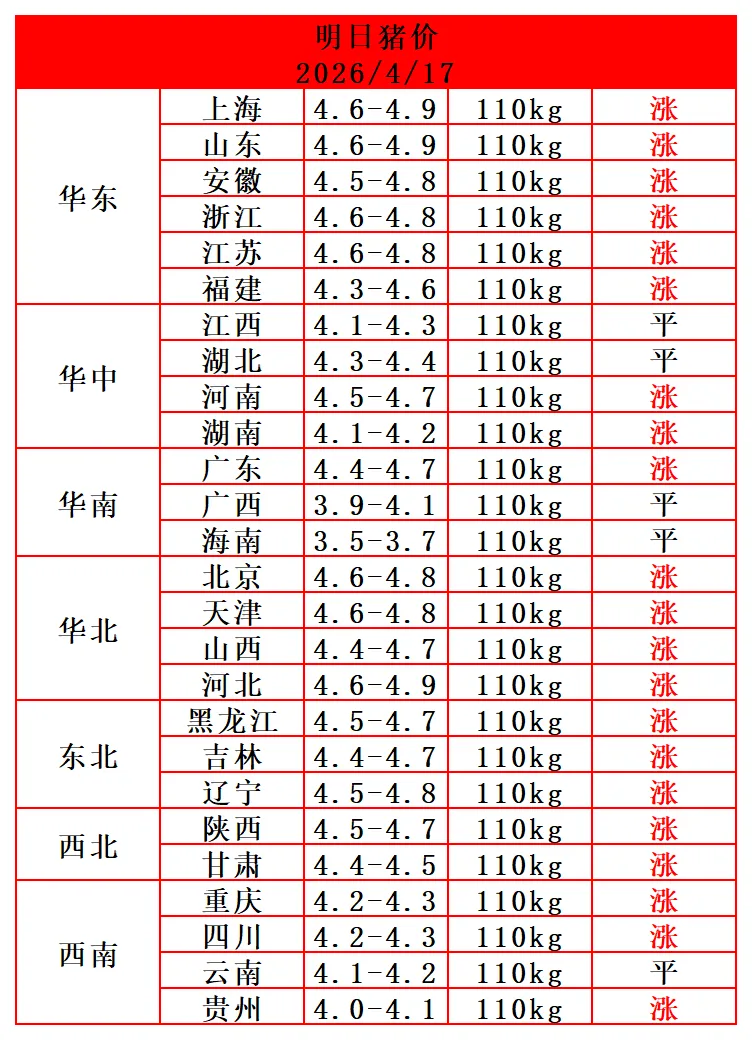 【明天猪价】 2026. 04. 17 猪价继续上涨! 养羊网 2026-04-17 【明天猪价】 2026. 04. 17 猪价继续上涨! 养羊网 2026-04-17 上一篇:涨,涨,涨,猪价上涨 下一篇:【养猪行情】2026.04.17-猪价行情 您可能还会对下面的文章感兴趣111: 相关文章 【猪价预测】2026年2月4日~2月6日全国猪价! 老天奶!怎么还有人觉得考公和考编差不多 策划给我的设计图 猪价行情(2026.3.5)︱仅供参考