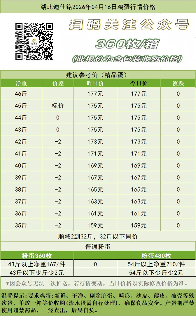 湖北迪仕铭2026年04月16日鸡蛋行情价格 养羊网 2026-04-17 湖北迪仕铭2026年04月16日鸡蛋行情价格 养羊网 2026-04-17 上一篇:湖北迪仕铭2026年04月16日鸡蛋行情价格 下一篇:【明天】-2026年4月17日全国鸡蛋价格(好消息,继续上涨!) 您可能还会对下面的文章感兴趣111: 相关文章 牧兜之窗2月25日猪价早知道 蒂乐斯每日分享(生猪、毛鸡、鸡蛋价格趋势)-第260124期 西贝关店102家:贾国龙回草原养羊,那4000名员工的退路在哪? 近期价格更新!!!