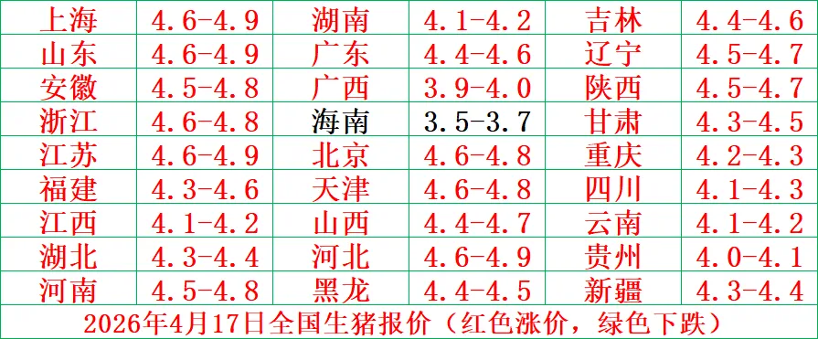 4月17日最新猪价 养羊网 2026-04-17 4月17日最新猪价 养羊网 2026-04-17 上一篇:【明天】-2026年4月17日全国鸡蛋价格(好消息,继续上涨!) 下一篇:专家:猪价下半年反弹必须的,但反转难现! 您可能还会对下面的文章感兴趣111: 相关文章 2026.3.24-明日猪价 02月25日宜春褐壳鸡蛋价格 鸡蛋价格一览|2026年3月1日鸡蛋价格(明日早知道) 10月23日全国早间猪价稳中震荡!