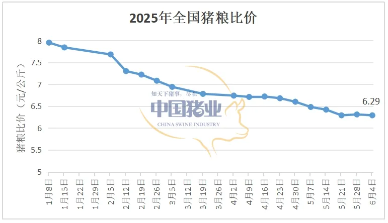 根据国家发展改革委发布的数据,截至6月第1周,全国大中城市猪粮比价6.29∶1,已连续5个月下滑,逐步临近过度下跌情形三级预警线。