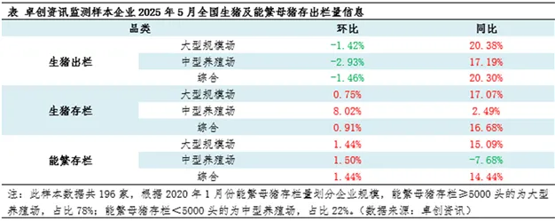 卓创资讯数据显示,5月份全国生猪存栏环比增加,中型养殖端与大型规模养殖集团存栏走势保持一致,均呈现增加趋势。区分规模来看,5月份大型养殖端生猪存栏量增幅收窄,而中型养殖端生猪存栏环比由负转正。
