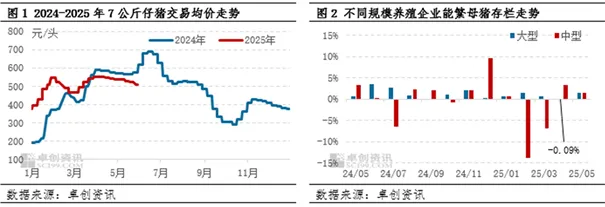 而从中型养殖端角度来看,由于5月仔猪成交热度下滑,价格亦呈持续下行趋势。截至5月底,卓创资讯监测7公斤仔猪交易均价为522.22元/头,较月初下滑15.56元/头,跌幅2.89%。部分前期通过外购怀孕母猪出售仔猪盈利的养殖场看跌心态增强,开始淘汰部分能繁母猪,此为中型养殖端能繁母猪存栏增幅收窄的原因。