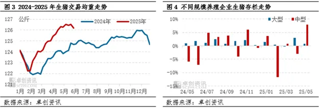 一方面,从生猪交易均重可以看出,5月生猪交易均重呈止涨下行走势,截至5月底,卓创资讯监测生猪交易均重为126.17公斤,环比月初下滑0.34公斤。由于5月份生猪价格呈下滑走势,加之气温逐渐升高,养殖端对后市行情信心不足,部分选择降重出栏,此为大型养殖企业生猪存栏增幅下滑的主要原因。另一方面,从体重降幅来看,企业降重并不彻底,因此生猪存栏仍为增加,但增幅收窄。