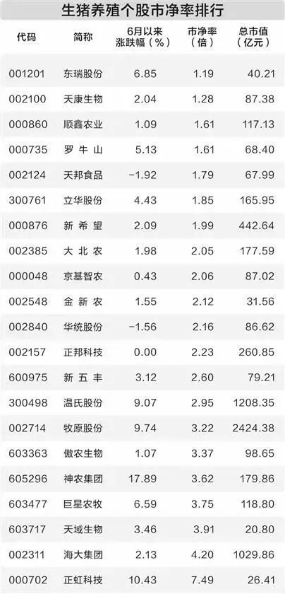 从估值上来看,仍有部分概念股处于低位,生猪养殖板块市净率均值为2.66倍,天康生物、东瑞股份最新市净率不足1.5倍,显着低于行业平均水平。