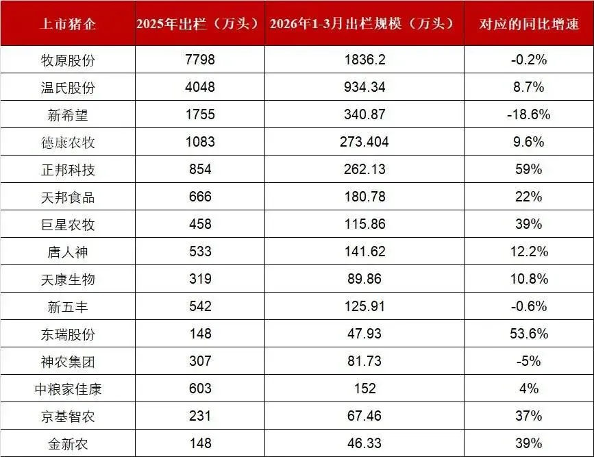 从2026年1—3月的出栏表现看,正邦科技、天邦食品、巨星农牧、东瑞股份、京基智农和金新农的出栏同比增速居前,短期成长性相对突出。