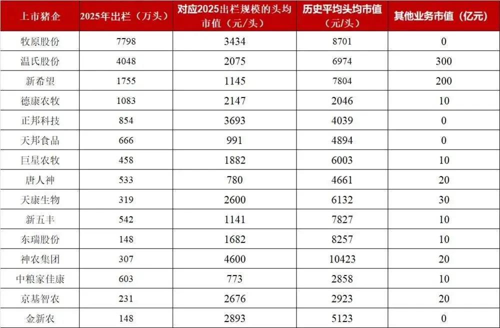 由于多数猪企并未披露2026年的出栏目标,我们统一采用2025年的出栏规模进行测算它们当前的头均市值,以供大家参考。