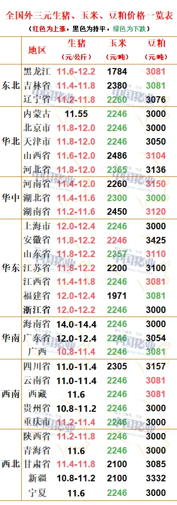 注:“红色字体表示涨、绿色字体表示跌、黑色字体表示与前一日持平”,数据来源于“猪小二”、行情宝,生猪的价格为“元/kg”,玉米、豆粕价格单位为“元/t”,此价格为生猪成交价格,仅供参考。