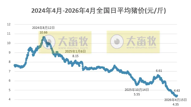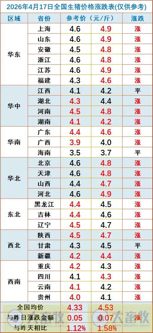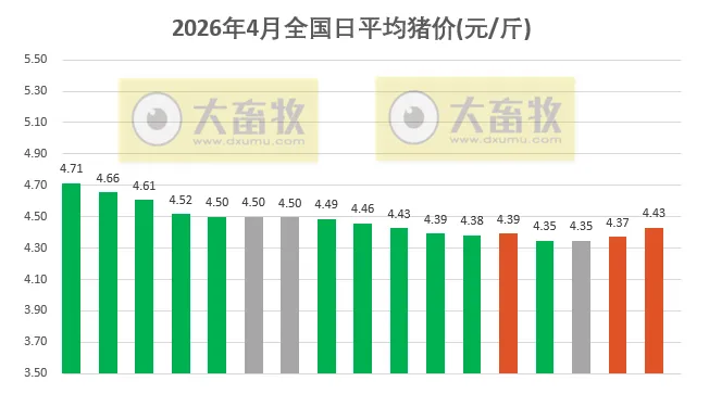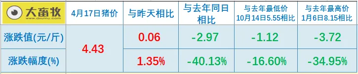 大畜牧小编根据我国27省的猪价数据,计算出2026年4月17日全国平均猪价为每斤4.43元,比昨天上涨0.06元,涨幅为1.35%,大幅上涨,连续2天上涨,为近7天最高价;