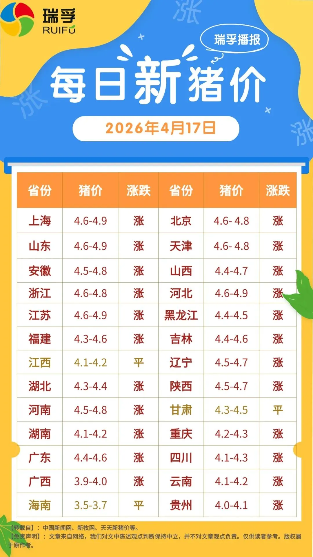 今日猪价 | 4月17日生猪价格 大面积飘红!! 养羊网 2026-04-17 今日猪价 | 4月17日生猪价格 大面积飘红!!编辑|瑞孚集团企划中心 养羊网 2026-04-17 上一篇:【猪价预测】2026年4月19日~4月21日!全国猪价! 下一篇:明天2026.4.17日鸡蛋价格预测 您可能还会对下面的文章感兴趣111: 相关文章 2025年4月13日全国各地生猪价格信息 【金色莱茵】2026-1-8猪价早知道 一周时间从设计到落地(服务中心)|现代风 2026.03.07全国猪价信息
