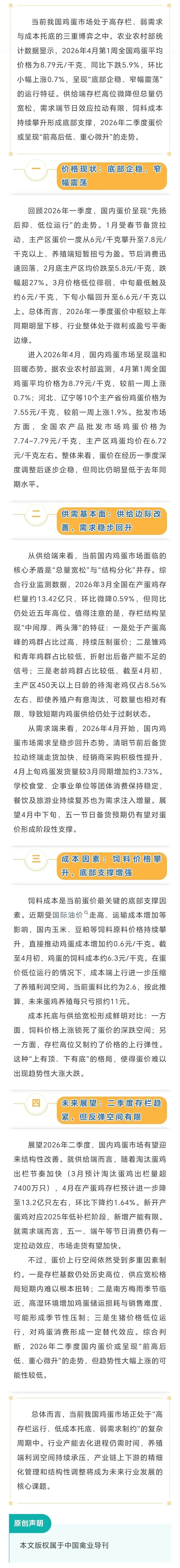 行情分析 | 2026年一季度国内鸡蛋价格走势及未来展望 养羊网 2026-04-17 行情分析 | 2026年一季度国内鸡蛋价格走势及未来展望 养羊网 2026-04-17 上一篇:一夜升温,23省猪价集体飘红,北方多地强势拉升!行情要变天了? 下一篇:2026.4.17-伞猪明日猪价-大面积飘红! 您可能还会对下面的文章感兴趣111: 相关文章 今日超前猪价| (2026.2.17)仅供参考 2026年1月21日今日鸡蛋价格早报--持续更新中…… 3月26日山东鸡蛋价格 如何经营好餐饮店:投身餐饮业要打好“小算盘”