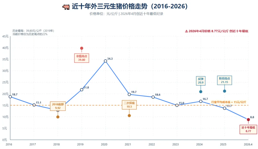 猪价:跌至8.77元/公斤,创近十年新低,仅为历史高点的22%;