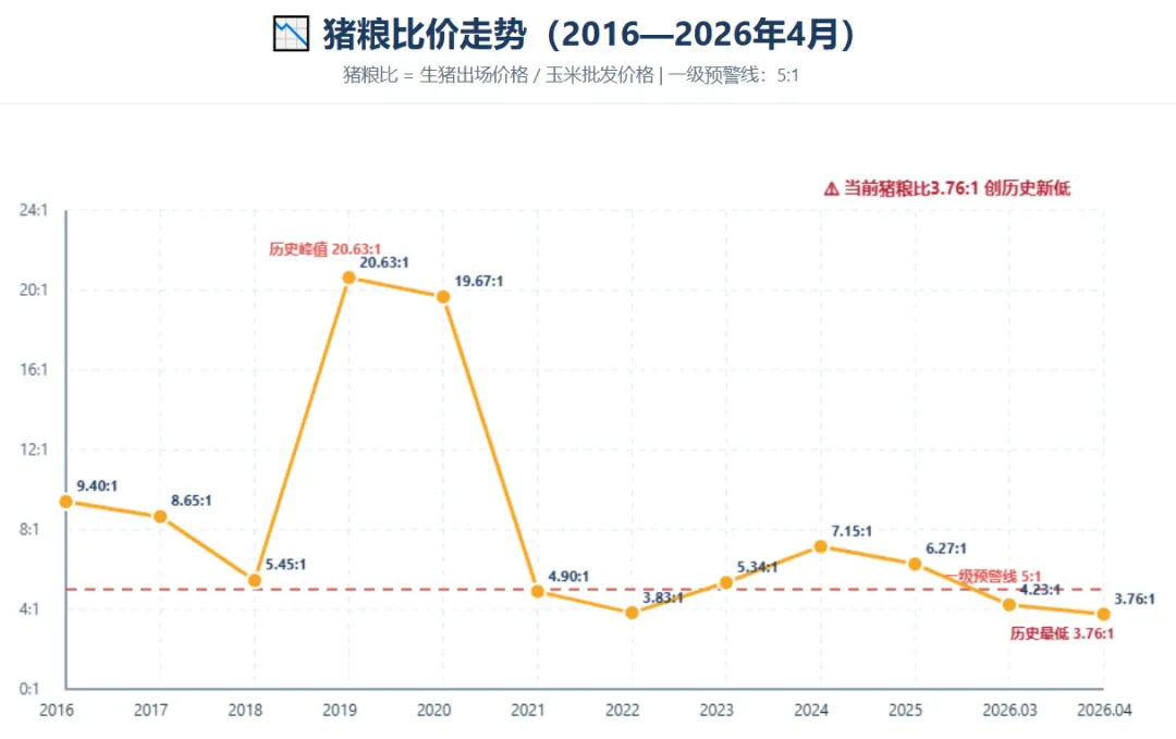 猪粮比:降至3.76:1,跌破2018年、2021年底部,刷新历史最低纪录;