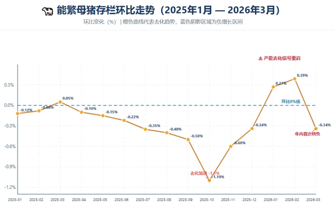 能繁母猪存栏环比:2026年3月再次转负(-0.34%),叠加前期去化峰值(-1.1%),产能出清已从“量变”转向“质变”。