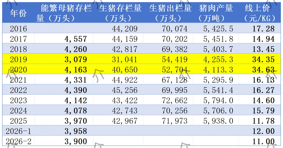 而截止2026年2月底,全国能繁母猪存栏量数量刚好为3900万头。我们来看下过去10年的相关数据: