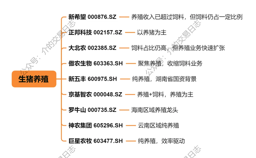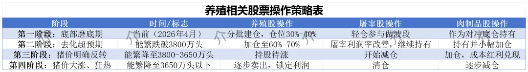 二、四类猪企 1. 养殖:周期反转的"最纯粹标的" 养殖企业的利润,几乎100%由猪价决定。 当前猪价跌破10元/公斤,自繁自养头均亏损已超过420元,全行业进入净现金流为负阶段。最惨的时候,恰恰是股价最可能出现阶段性底部的信号。 以牧原股份为例,2025年全年养殖完全成本已降至约12元/公斤,2026年目标进一步降至11.5元/公斤以下。 当前猪价已经低于养殖企业的现金流成本,产业进入深度亏损阶段,预计猪价仍将磨底一段时间。 养殖股的操作节奏:最先上车,最先卖出。 养殖股通常在猪价明确反转、产能去化兑现、市场一致乐观时,迎来"利好出尽"的卖点。当前是建仓区间,能繁降至3800-3650万头时是持股待涨区间,能繁降至3650万头以下时进入逐步卖出区间。 养殖股相关上市公司(综合企业另列):