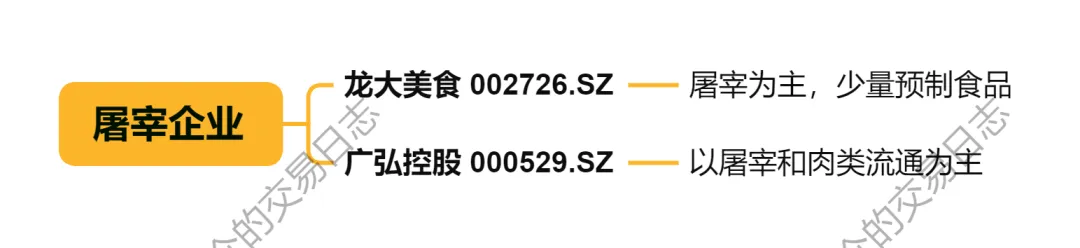 2. 屠宰:猪周期中的"波段机会" 屠宰的利润逻辑是:猪价越低,毛利越宽(前提是终端肉价不跟跌)。 当前猪肉产业链呈现"养殖端亏损、屠宰端保本、零售端价格僵持"的格局。 以双汇发展为例,2025年屠宰生猪1314万头,同比增长28%,屠宰产能利用率从40.8%提升至50.1%,屠宰营业利润约3.3亿元。更值得关注的是,其肉制品毛利率高达37.05%,在猪价下行周期中提供了极强的盈利稳定性。 屠宰股适合做波段操作: 当猪价处于底部、屠宰毛利持续改善时介入;一旦猪价反弹信号出现,屠宰的利润空间会被重新压缩,是减仓屠宰股的时机。 屠宰股相关上市公司(综合企业另列):