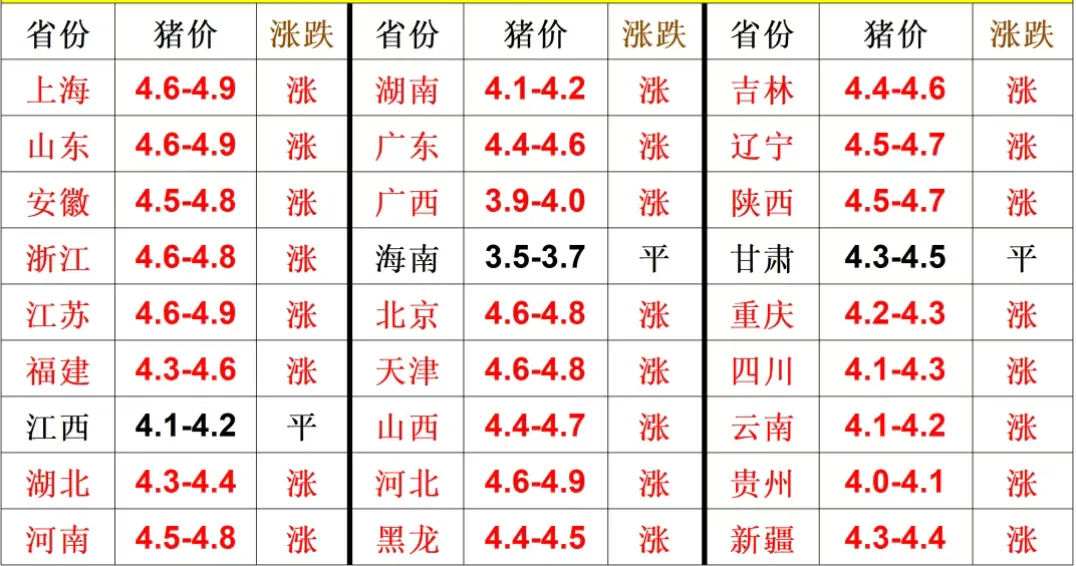 迎来上涨的省份包括:重庆、四川、云南、贵州、新疆、吉林、辽宁、陕西、黑龙江、北京、天津、山西、河北、广东、湖南、广西、河南、湖北、江苏、福建、安徽、浙江、上海、山东等地。目前基层生猪主流收购价格经过调整之后,总体维持在4.1~4.9元每斤左右,特别是目前的上海、安徽、浙江、江苏、河南、北京、天津、河北、辽宁、陕西等地的猪价已经达到4.7~4.9元每斤。