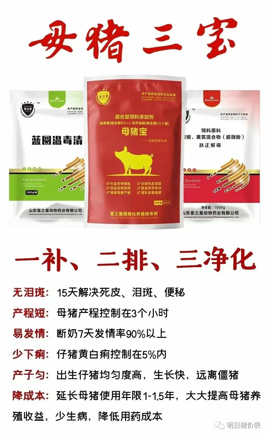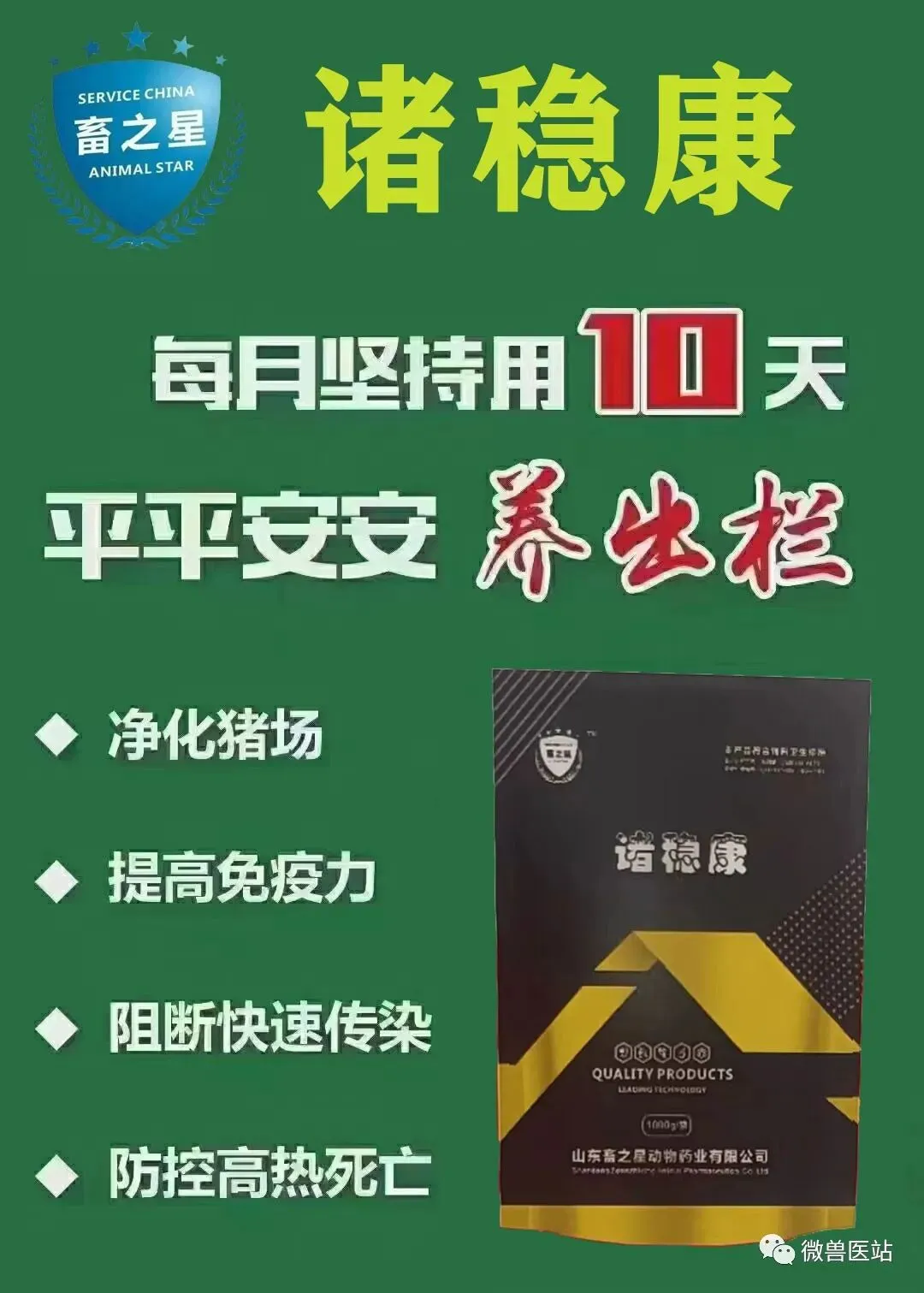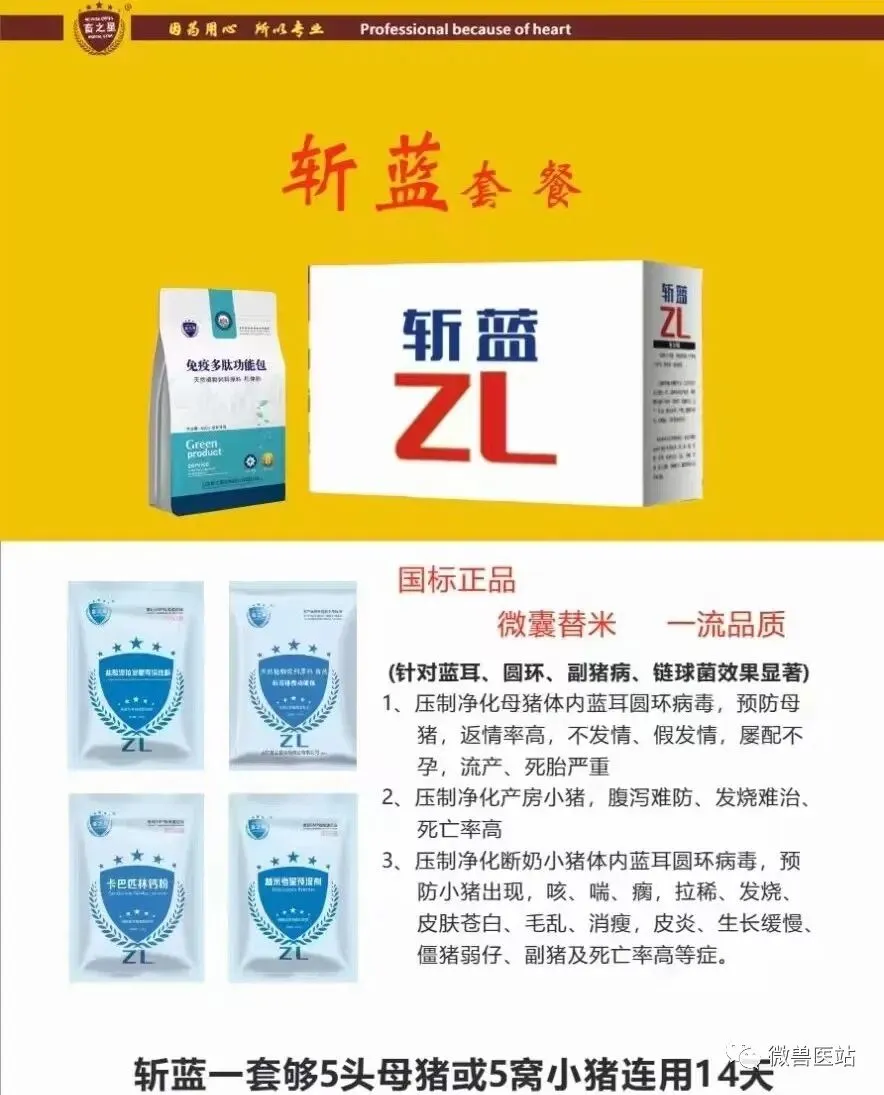 5天解决母畜便秘 15天消除泪斑 产程缩短2-3小时 每窝多产2-3头 奶水好,减少仔猪下痢 断奶后5-7天正常发情 延长母畜年限1-2年 针对蓝耳-斩蓝