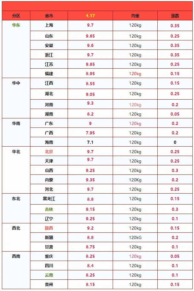 根据屠宰场调价情况,预计4月17日,外三元标猪报价将回升到8.86元/公斤,也就是4.43元/斤,单日上涨0.18元。