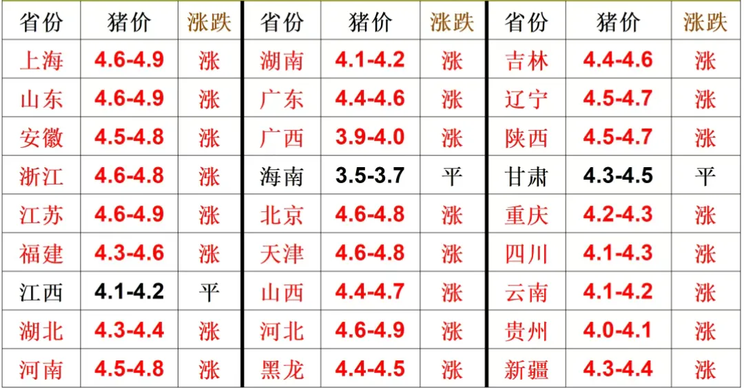 现在根据生猪屠企的相关报价情况来看,就在4月17日,猪价迎来上调的地区,包括:广东、广西、天津、北京、河北、山西、黑龙江、湖南、重庆、四川、吉林、辽宁、陕西、贵州、云南、新疆、山东、上海、浙江、安徽、福建、江苏、湖北、河南等地。