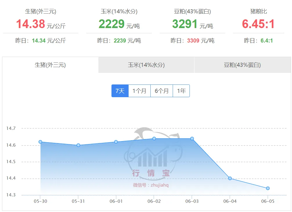 注:“红色字体表示涨或平、绿色字体表示跌”,数据来源于行情宝,生猪的价格为“元/kg”,玉米、豆粕价格单位为“元/t”,此价格为生猪成交价格,仅供参考。