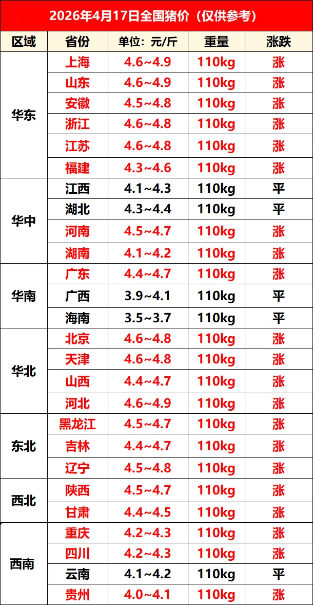 4月17日全国猪价火力全开!上涨“涨冒烟了”! 养羊网 2026-04-17 4月17日全国猪价火力全开!上涨“涨冒烟了”! 养羊网 2026-04-17 上一篇:26.04.18 猪价走势分析! 下一篇:今日猪价 | 2026.4.18明天猪价早知道! 您可能还会对下面的文章感兴趣111: 相关文章 养猪业在2025年将面临严峻寒冬 3月3日广西贵港鸡蛋价格参考 为什么粮食价格上不去? 一图读懂优质羊价格变化