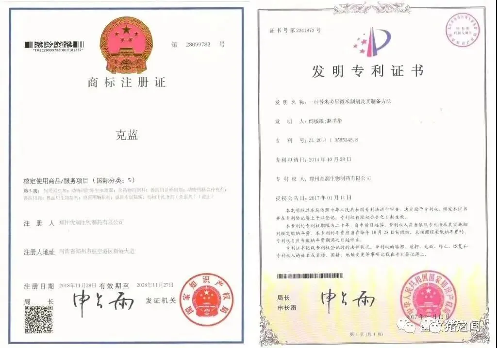 研究历程:克蓝是畅销产品从08年开始就已经使用,历经十多年年逐步完善,2016年初上报农业部门经过一年的论证研究证实,证明克蓝套餐,针对蓝耳,圆环,副猪,支原体,链球菌,具有很好的净化治疗效果,最后颁发克蓝套餐专利证书让更多养殖朋友信任产品,并且名字申请了商标证书,是具有唯一行,专属优润集团专用。下图是产品专利证书,商标注册证书.