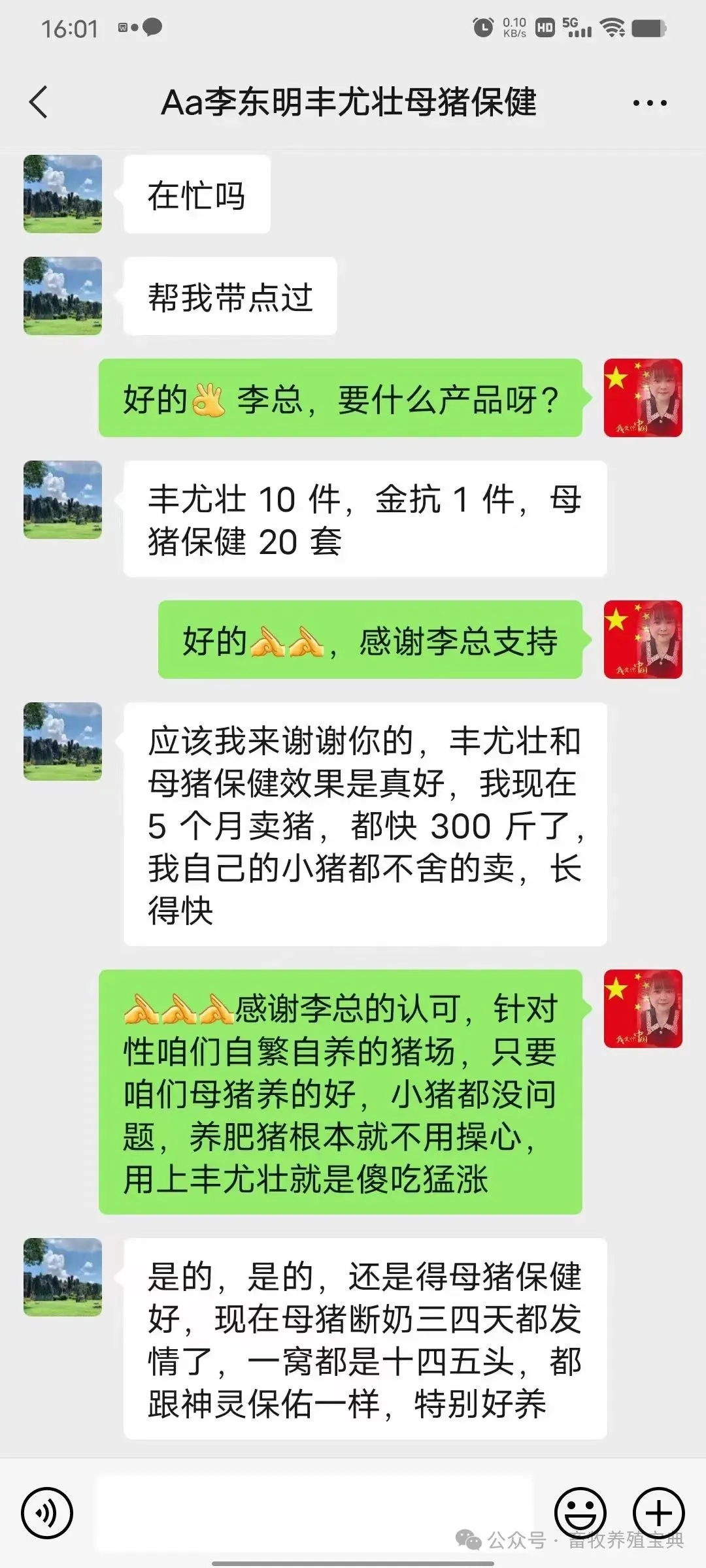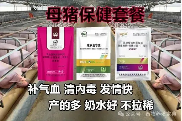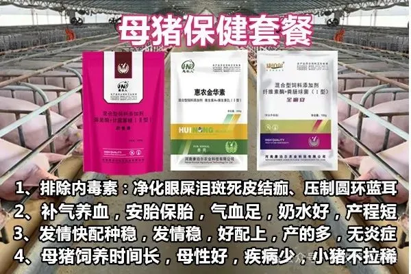 一、母猪使用时间怀孕 85天到产后7天二、使用药品惠农普康、全痢安、惠农金华素三、使用方法。母猪从配种85后开始使用?哺乳母猪料500斤加入欣普康1袋、惠农金华素4袋,产后1-3天每头母猪加全痢安2袋。四、达到实际功效1、减少母猪泪斑,便秘,死皮、颈背部出血点等。2、减少子宫炎、子宫内膜炎、乳房炎发生,增加泌乳量。3、清理母猪体内毒素,预防怀孕母猪流产,产子弱,母猪膘情均匀度高。4、提高母猪免疫力,母猪使用年限延长5、缩短产程确保4一7天正常一发情6、提高乳猪初生重,均匀度、降低乳猪黄白痢。产品特性:不便秘:三天解决便秘无泪斑:15天解决母猪泪斑产程短:母猪产程控制在3小时左右