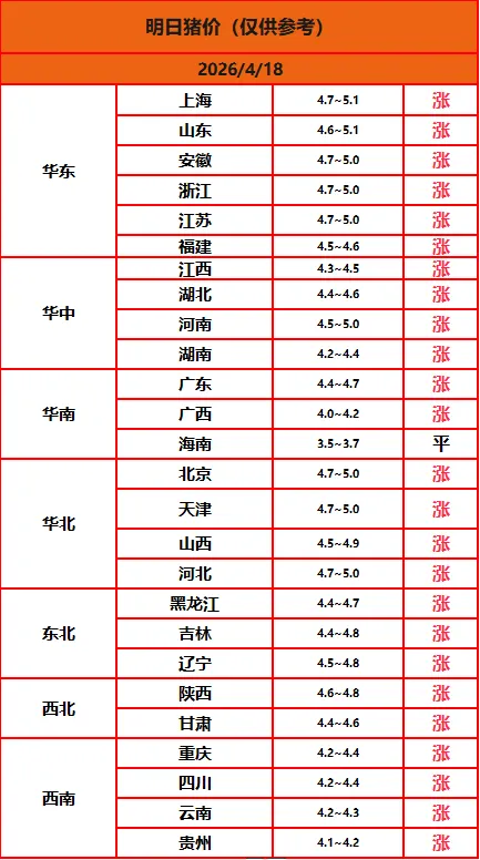 4月18日-明天猪价参考!(山东4.7-5.4元/斤! 继续涨!涨!涨!)