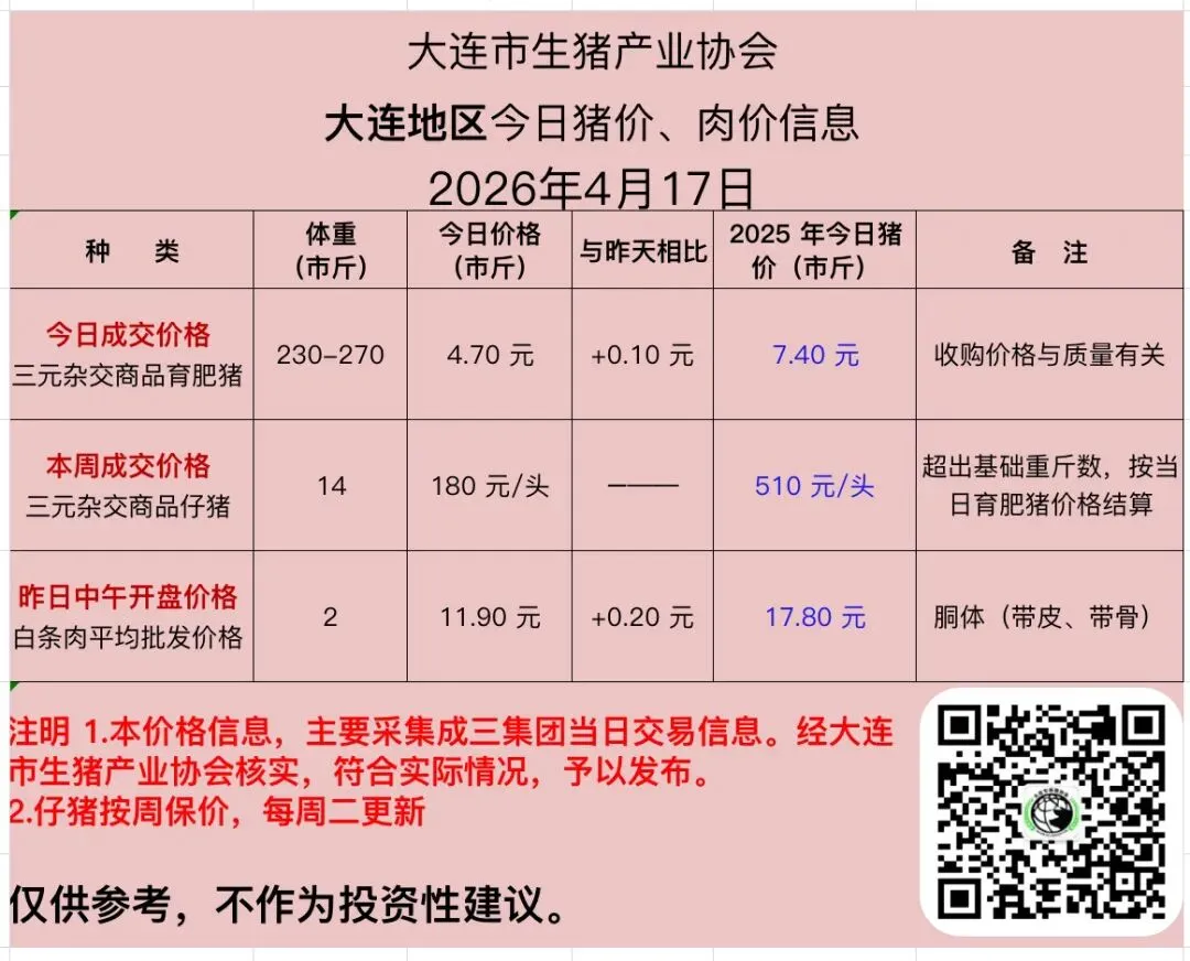2026 年 4 月 17 日猪价、肉价信息 养羊网 2026-04-17 2026 年 4 月 17 日猪价、肉价信息天天报价大连市生猪产业协会 养羊网 2026-04-17 上一篇:4月17日 粤港澳大湾区鸡蛋价格参考 下一篇:猪价呈现大部上涨,猪企出栏缩量拉涨 您可能还会对下面的文章感兴趣111: 相关文章 平稳丨今日鸡蛋价格(26年4月3日)参考 2025年4月13日全国各地生猪价格信息 近期价格更新!!! 【明天猪价】 2026. 01. 30 明日全国猪价早知道!