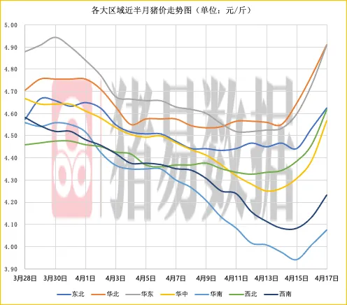 东北、西北、华北、华中、华东、西南、华南地区猪价呈现上涨,生猪平均价格小幅上涨。
