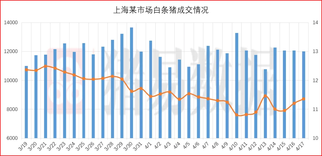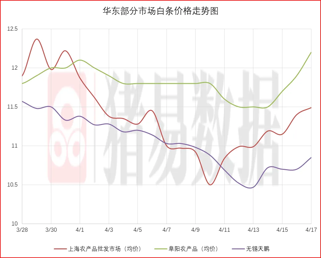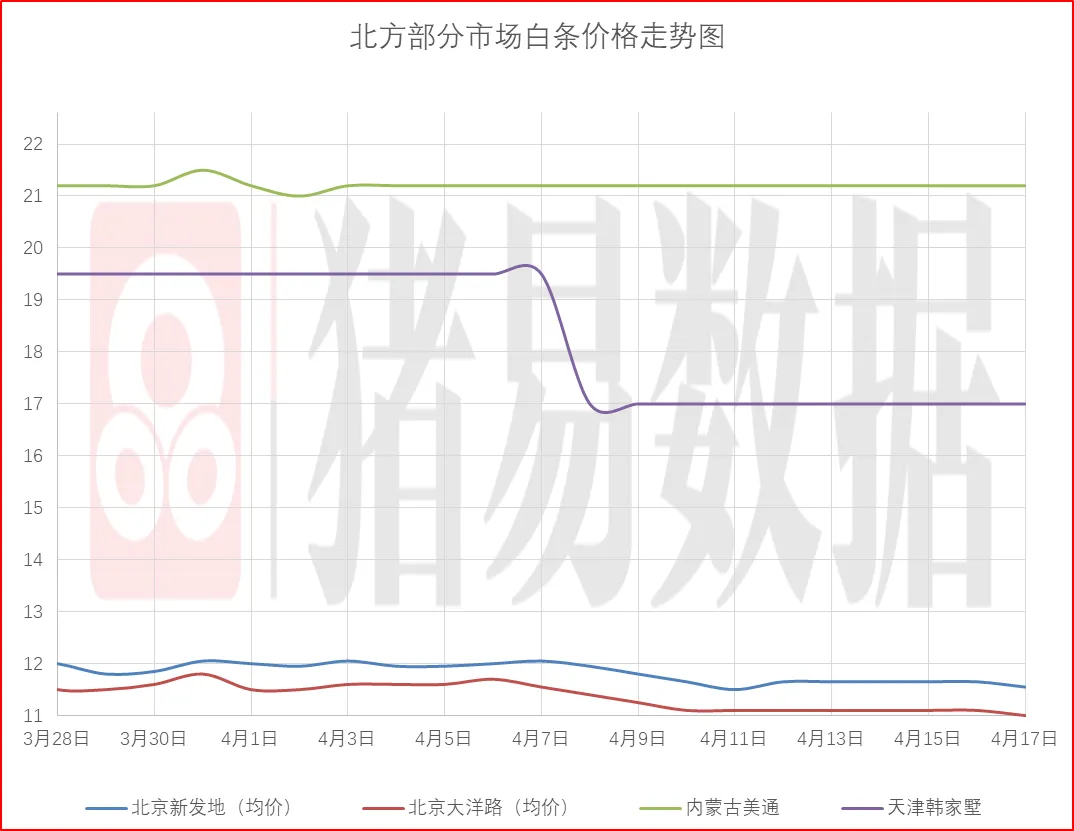 从今日北京、上海消费城市批发市场白条价格走势来看,北京、上海批发市场白条开磅价格呈现上涨,北京大部分市场开磅价格上涨0.1-0.2元/公斤,市场走货速度表现一般偏差;上海市场价格呈现上涨态势,部分市场成交价参考11.36-11.49元/公斤,到货量表现有所减少,市场交易情况表现一般偏好,市场成交均价表现一般偏好。